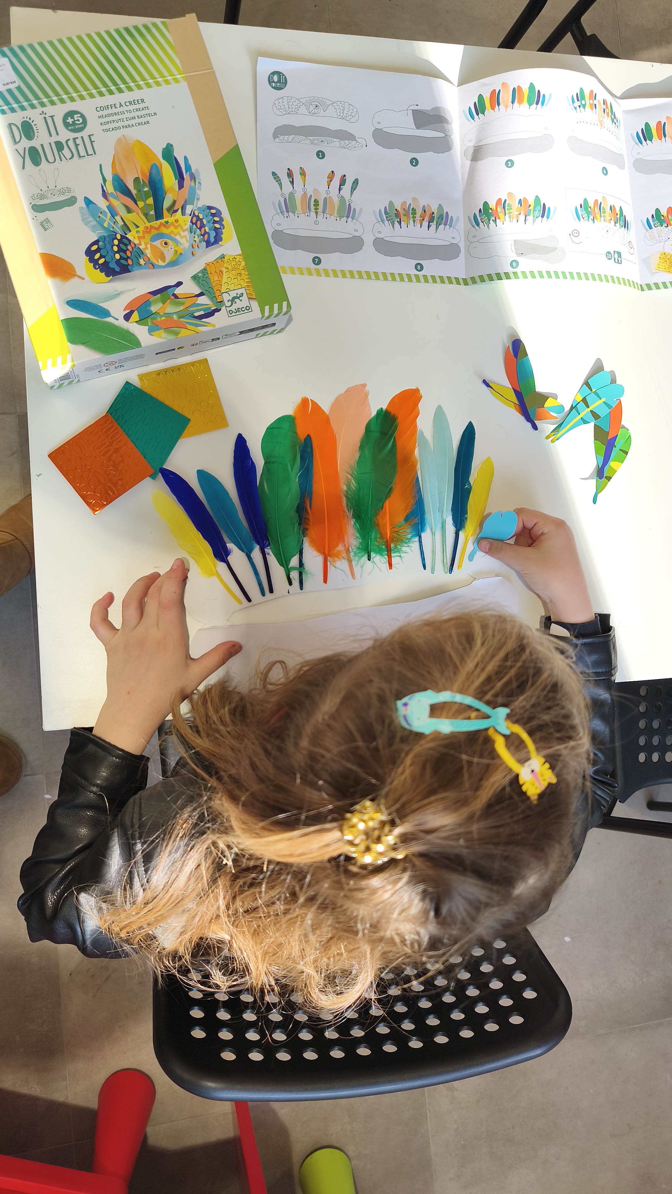3. Wenn die Reihenfolge der Federn, die sich überlappen können, zufriedenstellend ist, zieht man die zweite Klebefläche ab, faltet sie und klebt sie auf die erste. So entsteht eine schöne Basis für ein festliches Stirnband. Wir bekleben die Vorderseite des Stirnbands mit den ausgefallenen Aufklebern entweder nach der Anleitung oder nach eurer eigenen Vorstellung, so dass euch das Ergebnis gefällt.