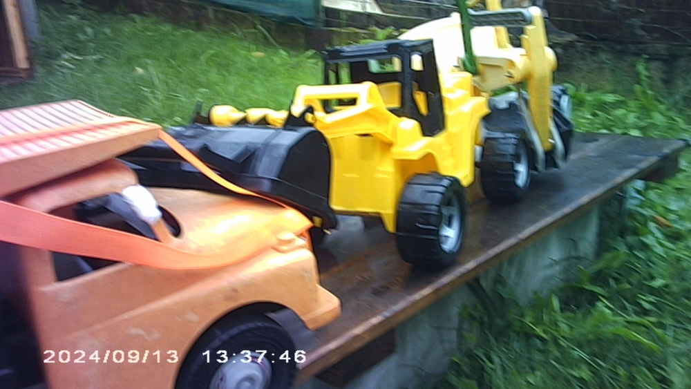 (Kommentar: Der Unterschied bei den Außenaufnahmen ist deutlich - Zoofamily gibt naturgetreuere Farben und Zeichnungen wieder, der Himmel wird auch bei Regen besser eingefangen. Die chinesische Kamera gibt die Farben seltsam wieder - man sieht es besonders bei den Steinen - eine Seite ist lila. Der Himmel wurde komplett weggelassen. Bei den Baggern war so wenig Licht, dass Adam nicht einmal die Kamera ruhig halten konnte).