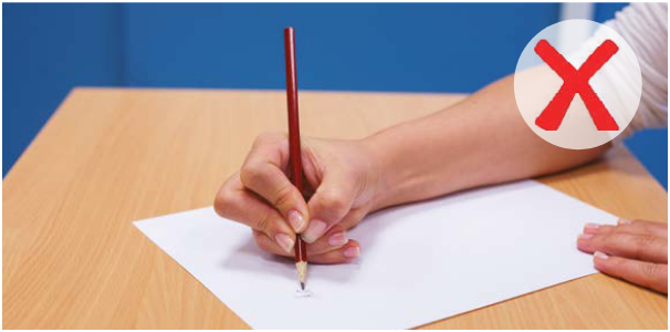 Der Mittel- und der Zeigefinger sind an der richtigen Stelle. Der Daumen sollte dem Zeigefinger gegenüberliegen, ist aber über den Bleistift gestreckt. Dieser Griff erschwert es, die Hand auf dem Notizbuch zu bewegen. Mit der Zeit kann das Handgelenk unbeweglich werden, und es bildet sich ein krallenartiger Griff, der es unmöglich macht, das Handgelenk beim Schreiben zu bewegen.