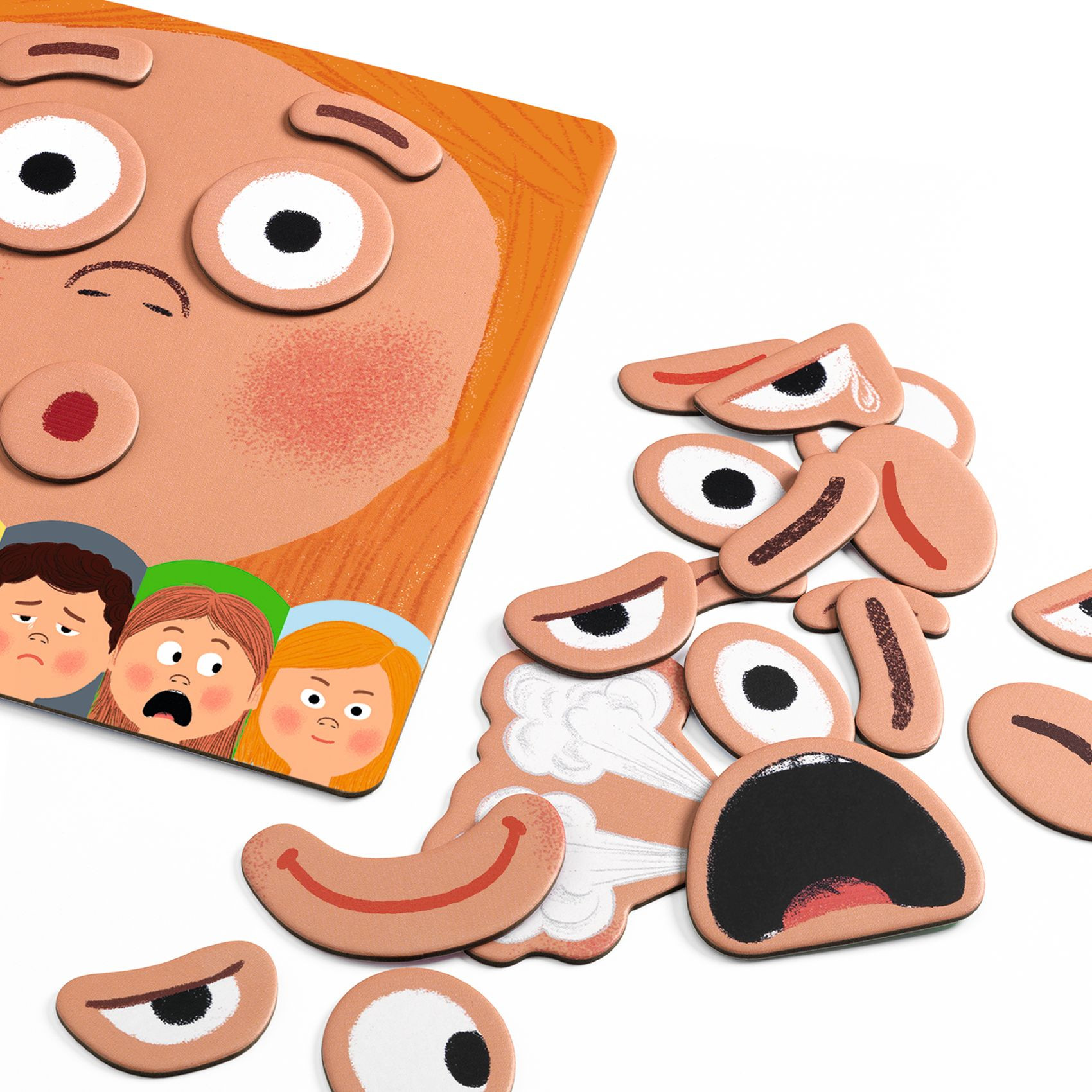 - Ein Spiel zum Erlernen und Entdramatisieren der Gefühle dank der nachzuahmenden gerührten Gesichter, die sich auf dem Spielfeld befinden.